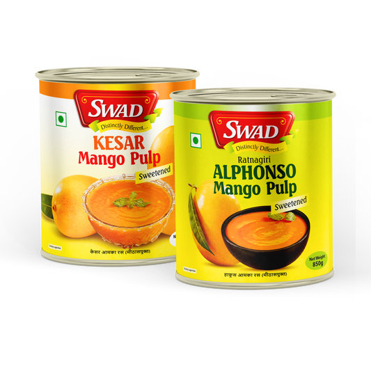 SWAD Combo Pack of Kesar Mango Pulp No added Sugar & Kesar Mango Pulp Sweetened 850g